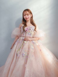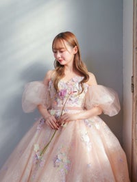 刺繍ビージングレースと立体のお花が、フェミ二ンで可愛い女性の夢を叶える1着です。