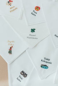 白を基調としたハンカチに、ゲストおひとりおひとりのお名前を刺繍いたします。