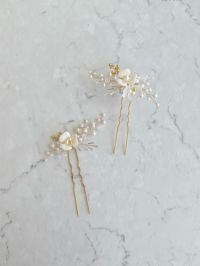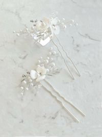 ブライダルベールのお花の周りに、パールやビーズが繊細に美しく散りばめられたデザイン。