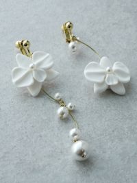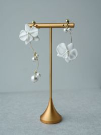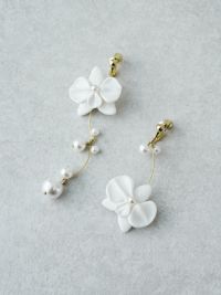 耳元でふんわり揺れる、大ぶりの胡蝶蘭がパッと目を引くアシンメトリーデザイン。