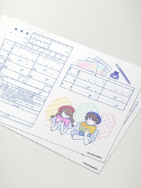 ベレー帽をかぶったお二人が並んで座り、仲良く漫画に読みふける姿を描いた婚姻届。