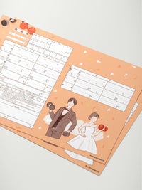 ダンベルを手に、息ぴったりでトレーニングするふたりを描いた婚姻届。