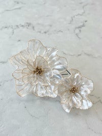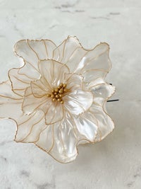 ゴールドの枠にパールのお色の花びら、お花の中心の花芯はゴールドになっています。