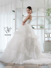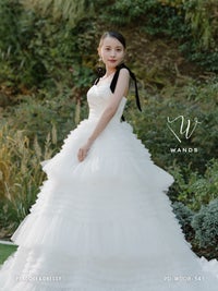 ラッフルとティアードの リズム感のある切り替えデザインが印象的な ボリューム感たっぷりのチュールドレス。 アクセントのベロアリボンは、付けはずし可能な2wayです。