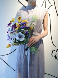 ブルーとイエローを基調にしたお花を束ねたPLACOLE&DRESSYオリジナルブーケの登場。