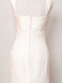 背中にはファスナーに重なるように人気のくるみボタンが連なり、