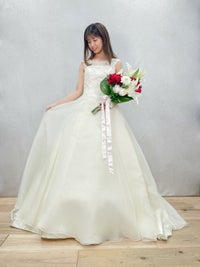 柔らかいオーガン素材を使用したフェミニンな印象のAラインドレス