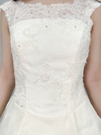 上半身はオフショルダーのお袖付で繊細なレースで施されています。
