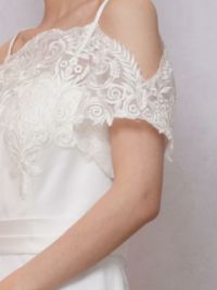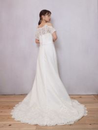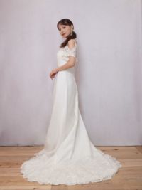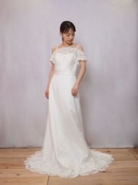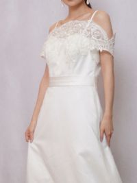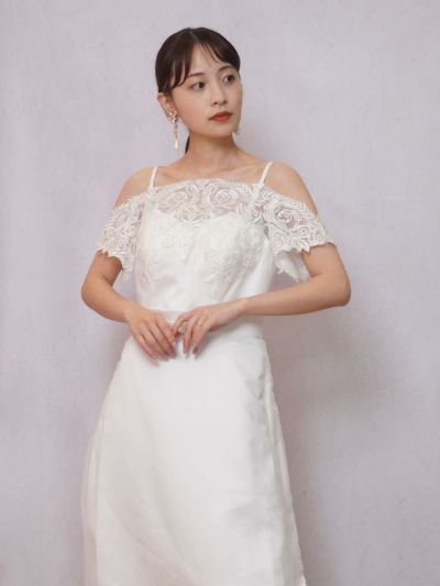 トップスはレースのオフショルダーが美しく、女性らしいデコルテラインを演出。