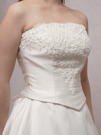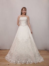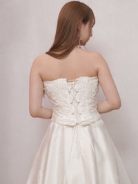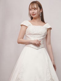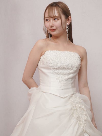 胸元には細やかなレースやビーズの刺繍がたっぷりと施されています。